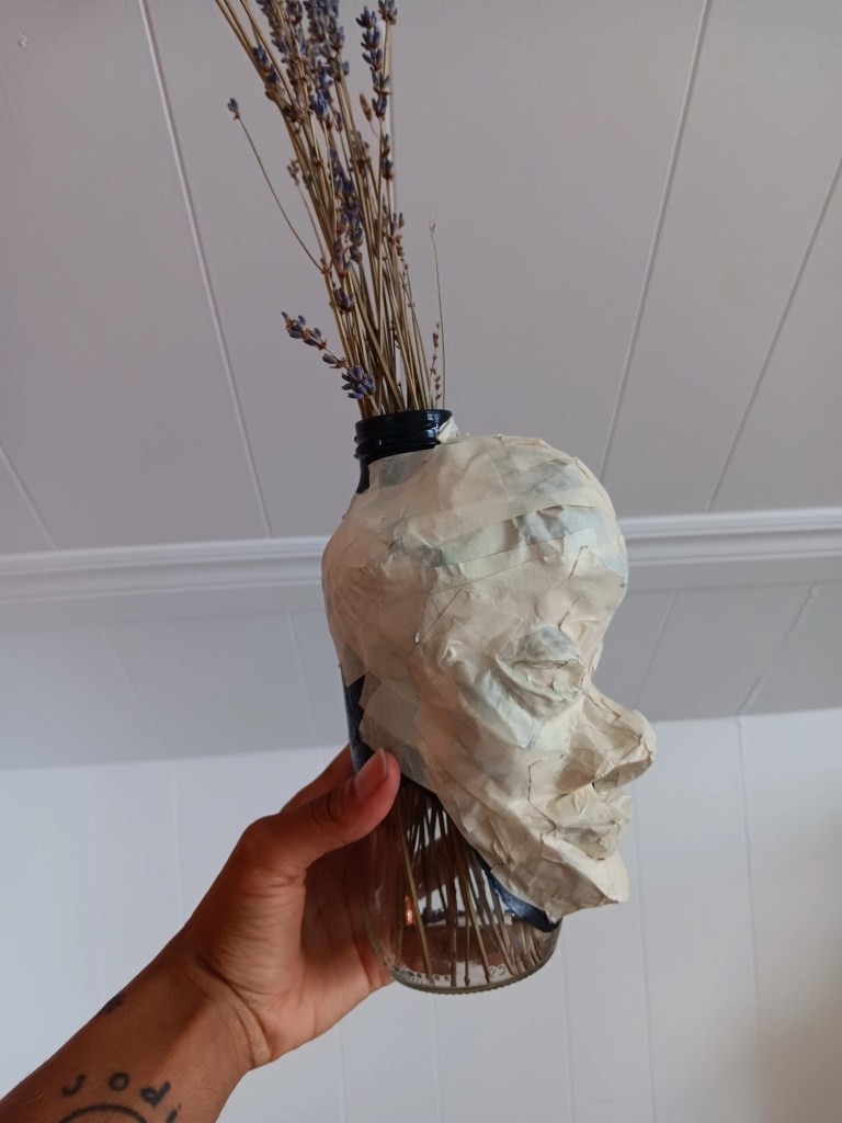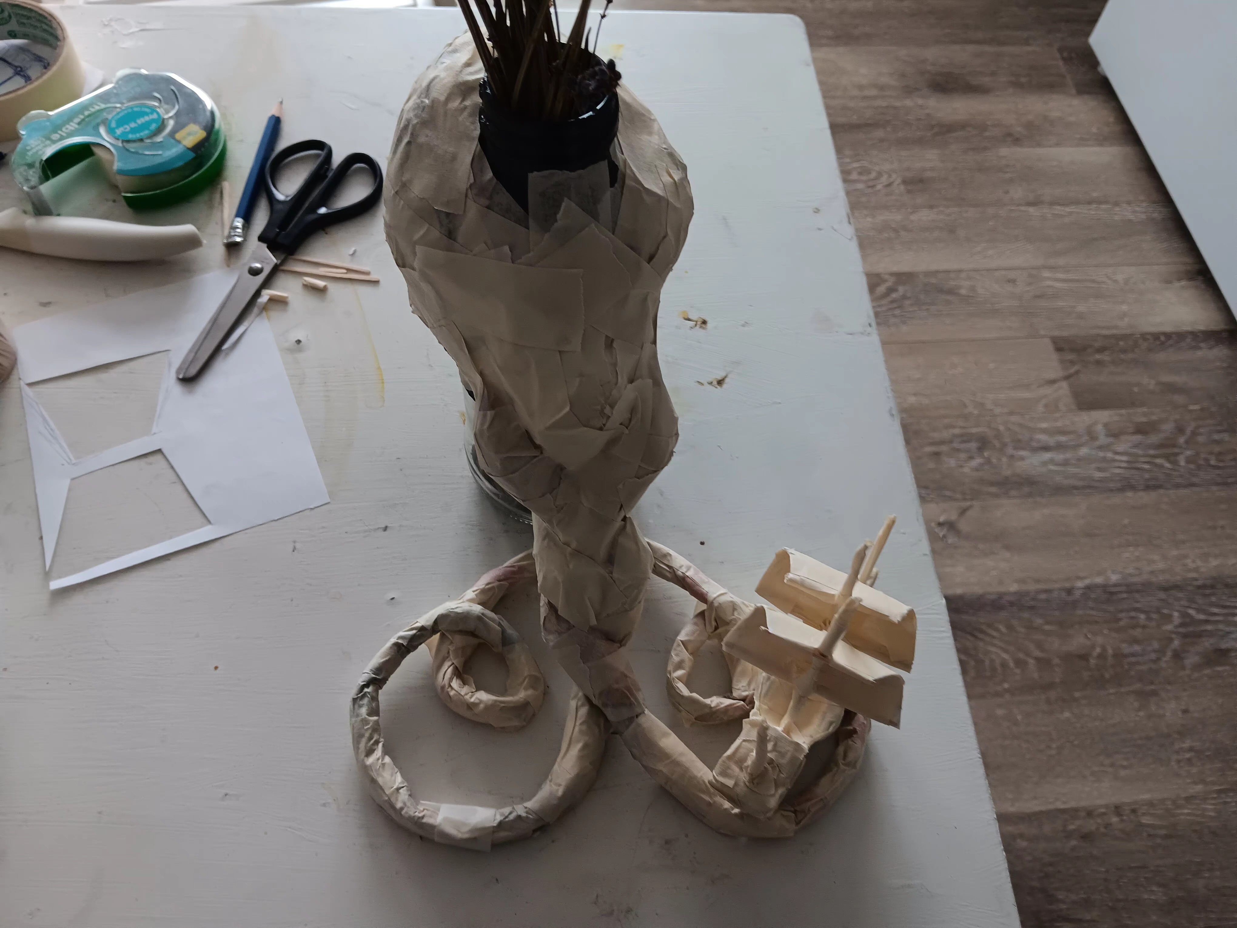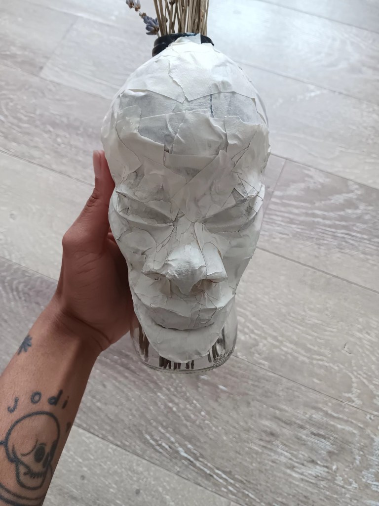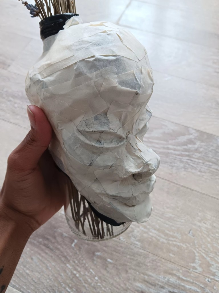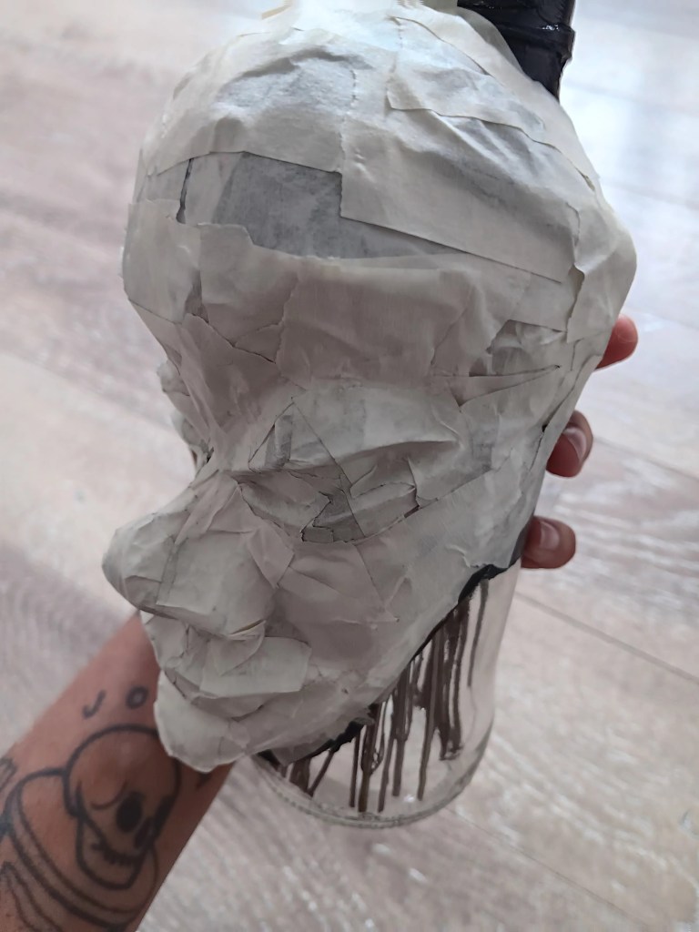 Éventuellement, il sera recouvert de mon mélange à papier-mâché (il est au congélateur en ce moment pour éviter la pourriture de la farine et des fleurs séchées). La structure est légère mais à cause de la forme du front, le papier-mâché séché va l’allourdir.