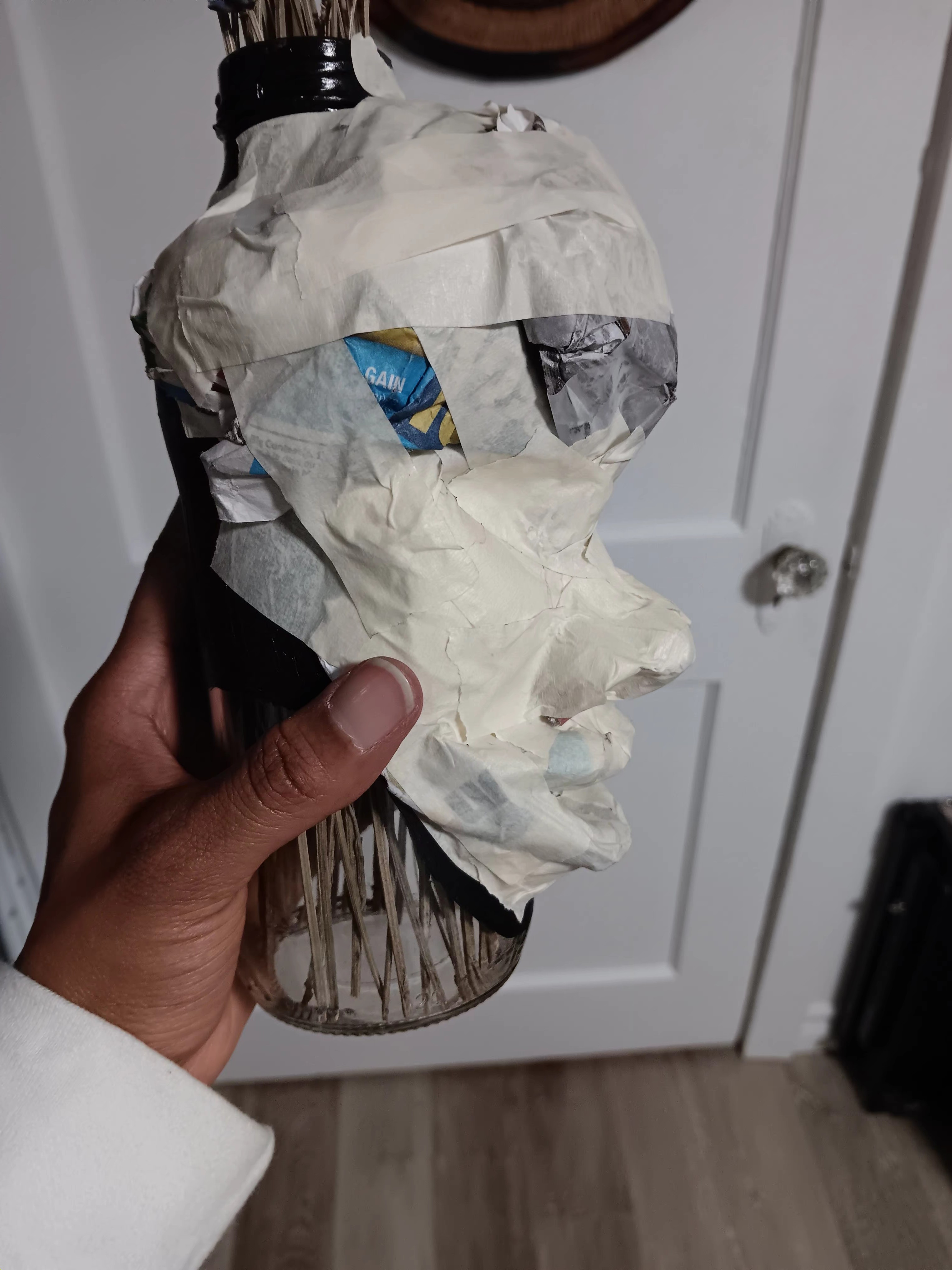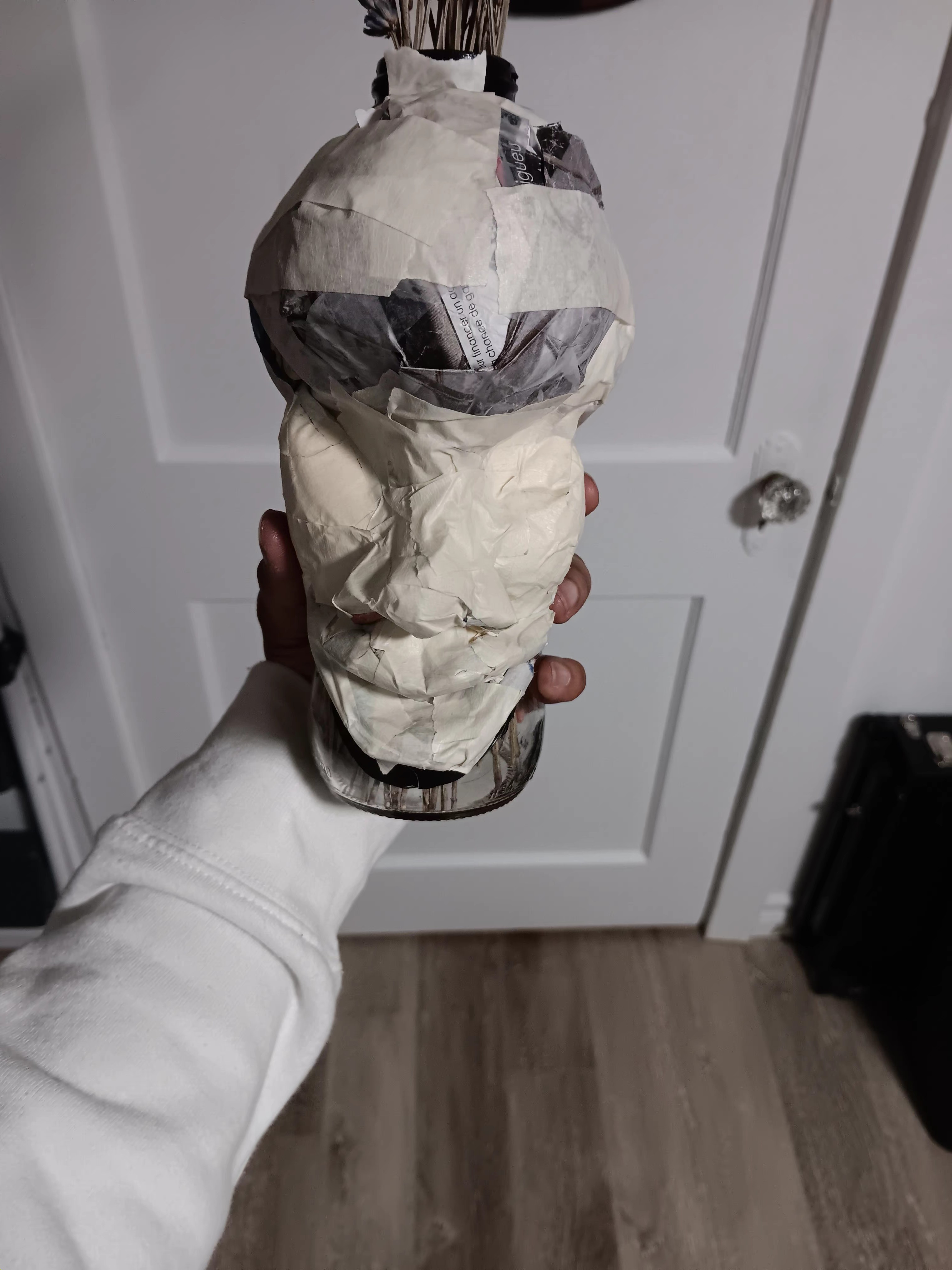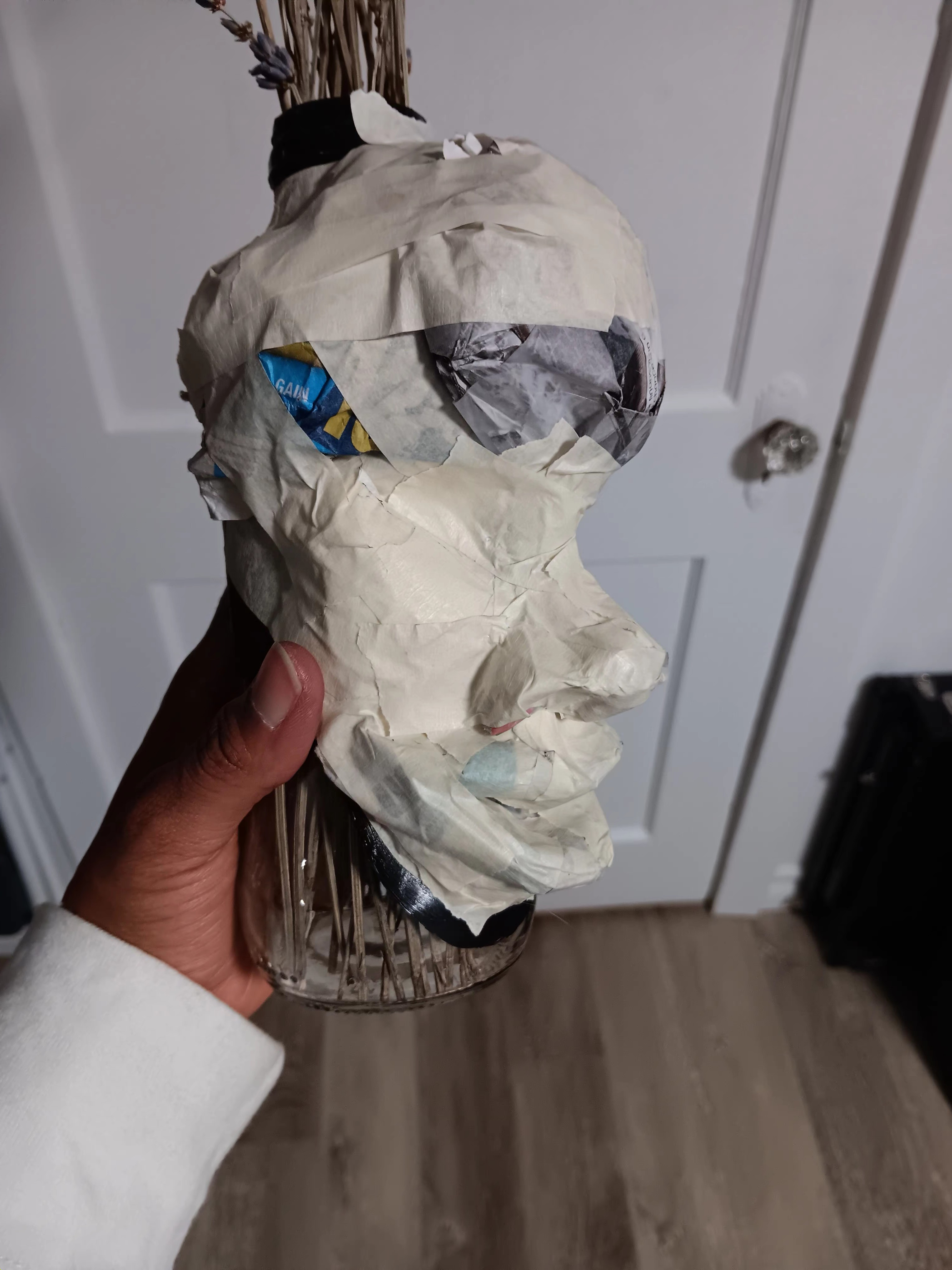 Éventuellement, il sera recouvert de mon mélange à papier-mâché (il est au congélateur en ce moment pour éviter la pourriture de la farine et des fleurs séchées). La structure est légère mais à cause de la forme du front, le papier-mâché séché va l’allourdir.