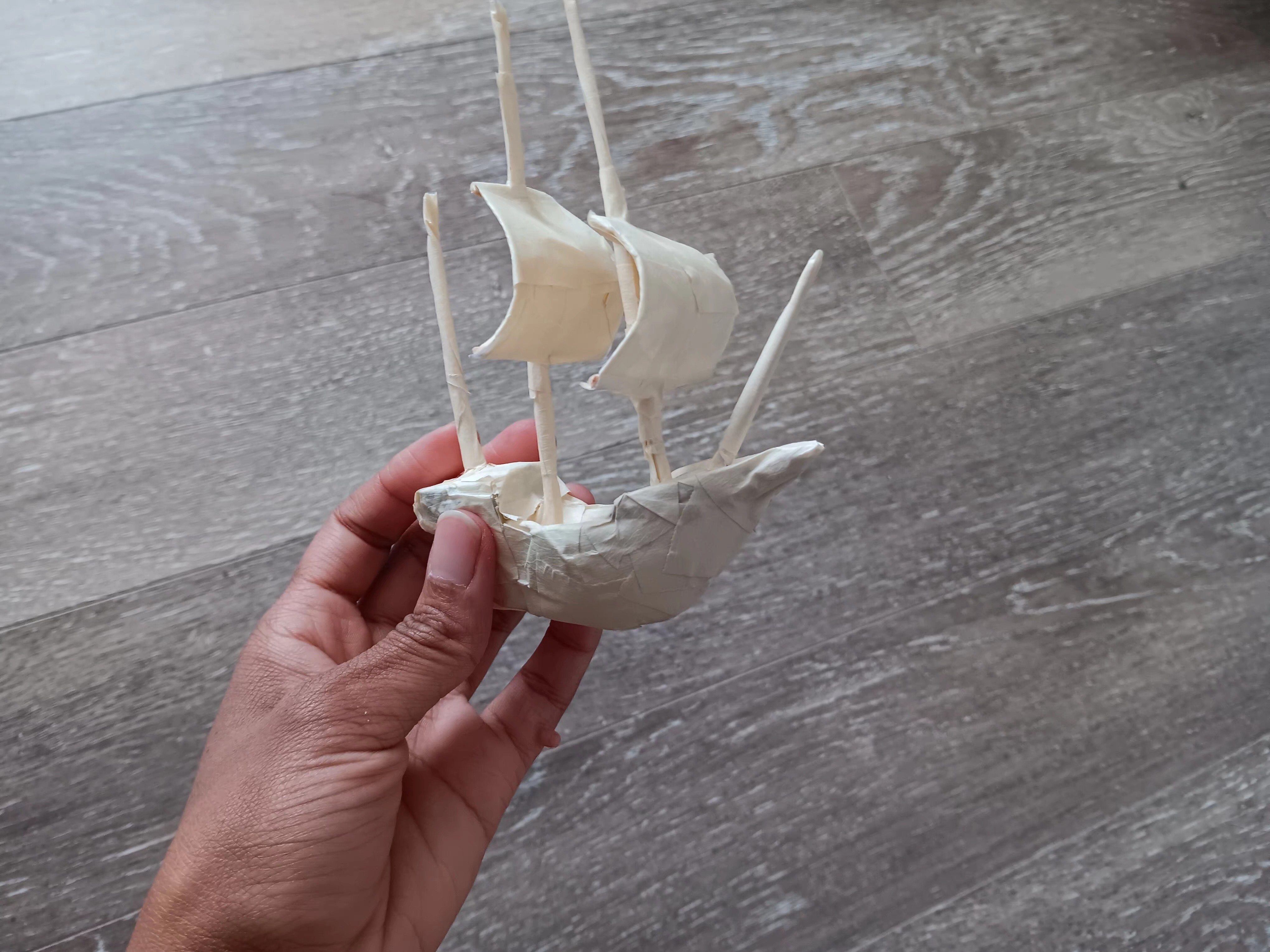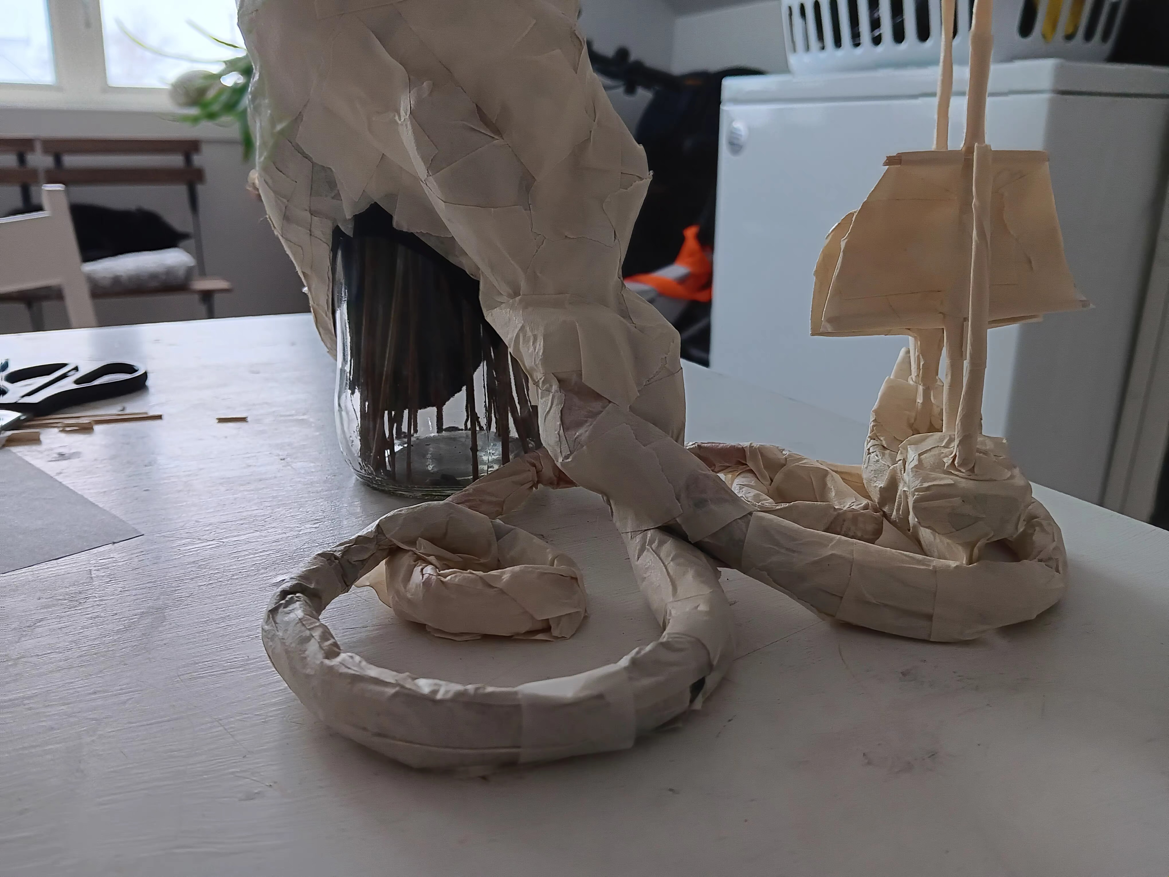 l’espace où je pensais écrire du texte s’est métamorphosé en tresse qui se transforme à son tour en eau de mer. Pour prévoir la hauteur des vagues, j’ai commencé le navire de pirate. Aye, toute une aventure. C’est après la deuxième voile que mon estomac m’a dit « ça suffit ».