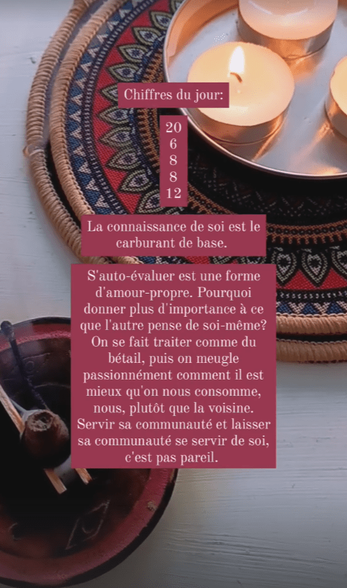 Le but principal était de m’exercer à interpréter les cartes avec beaucoup plus d’aise. Bien que ça fasse un peu plus de trois ans que j’ai commencé à tirer le tarot, je ne l’avais jamais fait de manière assez régulière pour ne pas utiliser mon petit livre d’interprétation comme béquille. Ces réflexions sont partagées en story du compte Instagram de mon quotidien.